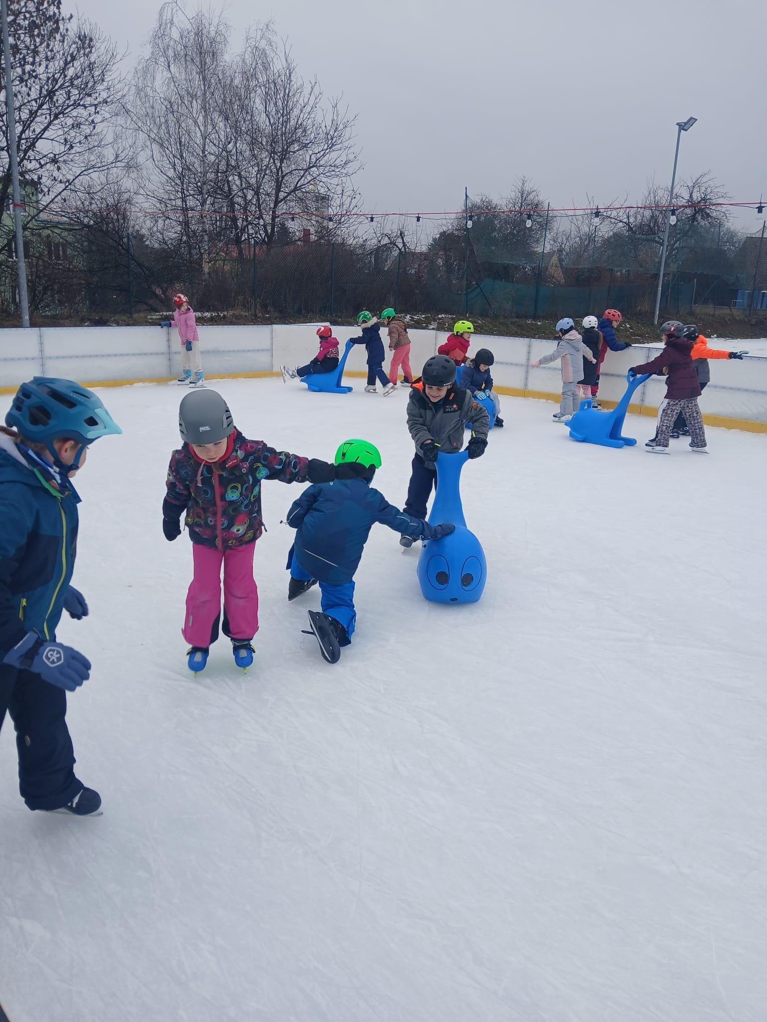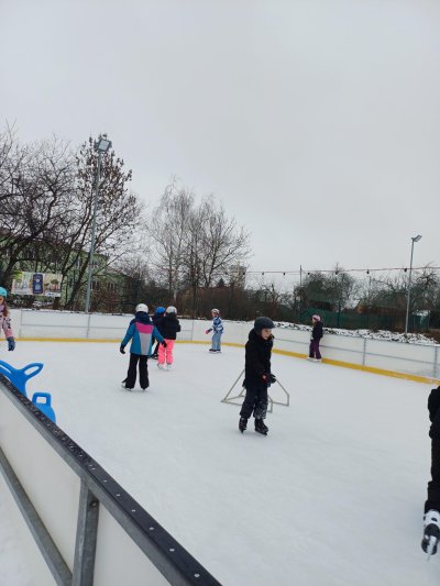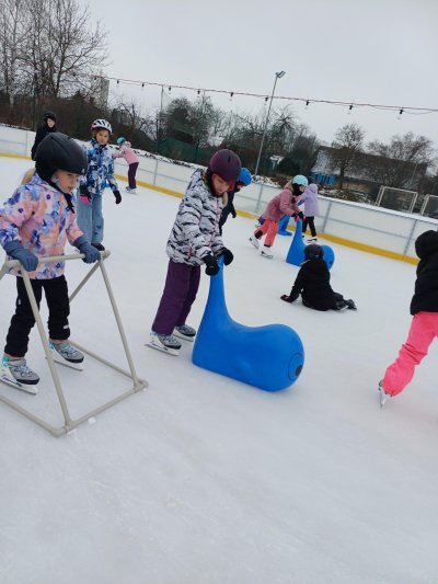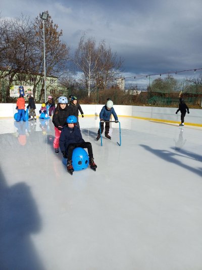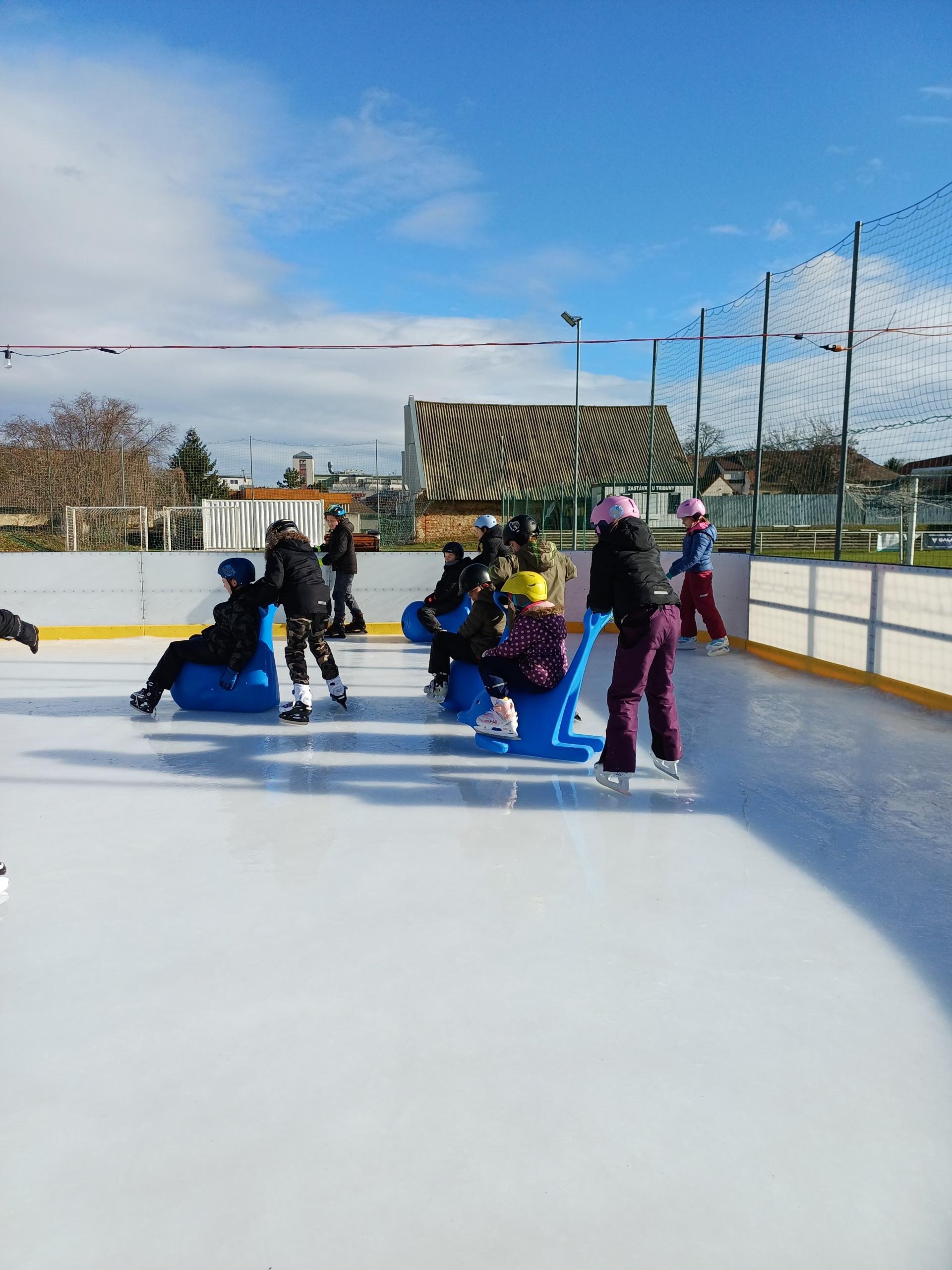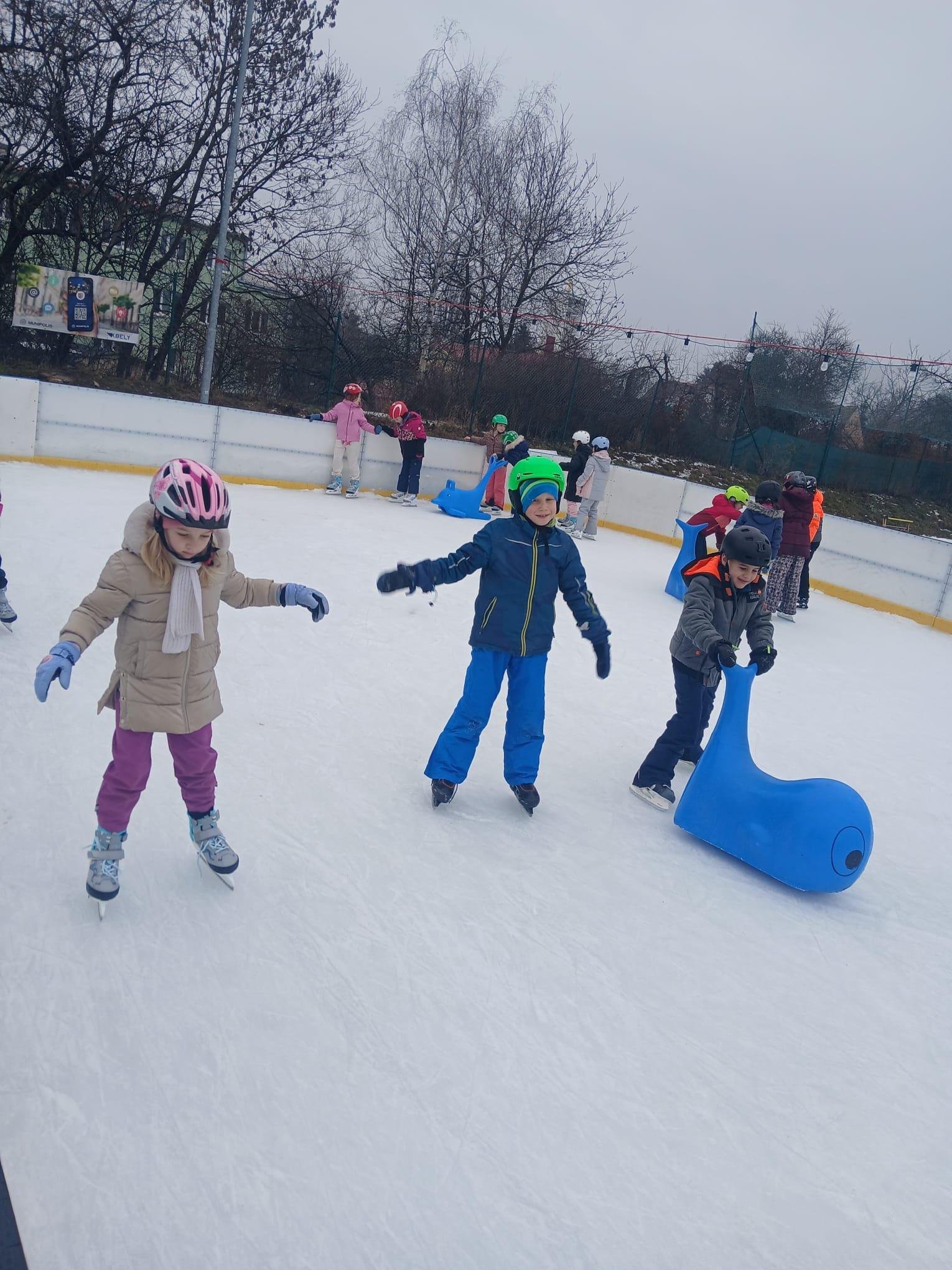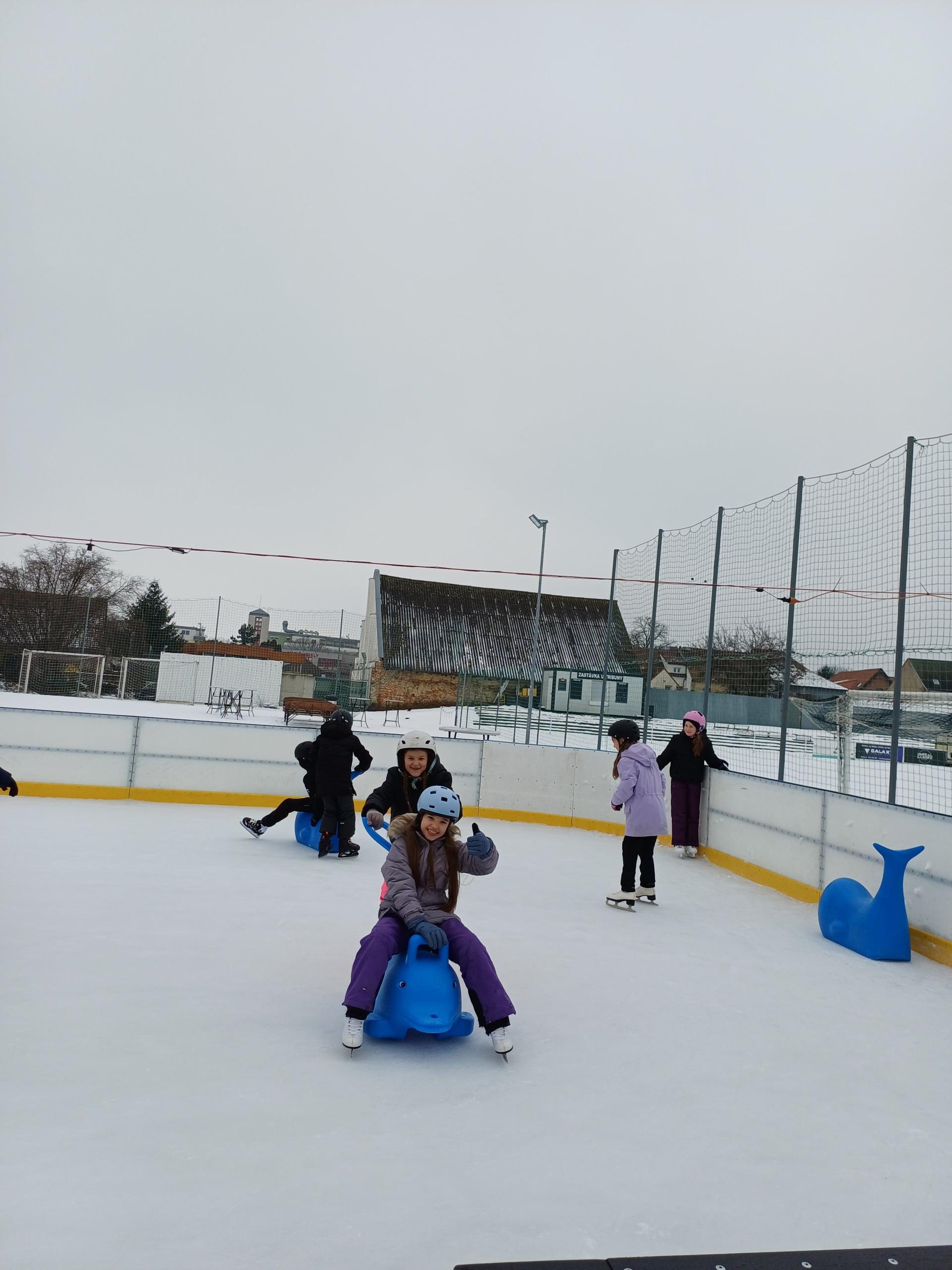 Naše školní družina se letos vydala několikrát na bruslení na fotbalovém hřišti Spartak. Každá návštěva ledové plochy byla jiná. Počasí se dětem pokaždé postaralo o jiné podmínky. Zažily opravdovou zimu, kdy je mráz štípal do tváří, ale také den, kdy poprchávalo. Jednou je dokonce překvapilo sluníčko, kdy ledové plocha roztávala a děti se mohly téměř koupat.