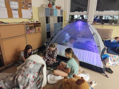 Březnový projektový den byl tradičně věnován dni a noci s Andersenem. Některé třídy zažily přednášky od spisovatelů, jiné připravovaly divadlo pro druhé třídy a některé z nich měly i večerní program. Našly se i třídy, které přespaly ve škole.