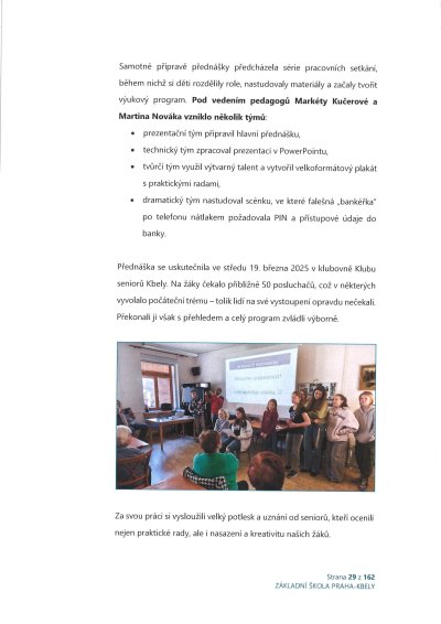 Rok plný nových projektů, zážitků a úspěchů jsme uzavřeli oficiálně. Školská rada dne 22. října schválila Výroční zprávu o činnosti Základní školy Praha-Kbely za školní rok 2024/2025. Zpráva přináší nejen přehled o výuce a hospodaření, ale také pohled na každodenní dění, spolupráci s rodiči, akce, soutěže i drobné radosti školního života.
