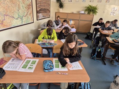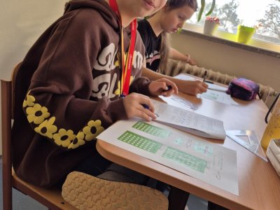 Matematicko-logická soutěž. Soustředění jelo na plné obrátky, často se hlava zavařila, ale nakonec práci odevzdali všichni. :-) Nejúspěšnější byli Ondra, David, Lexa, Sofie a Terka K.